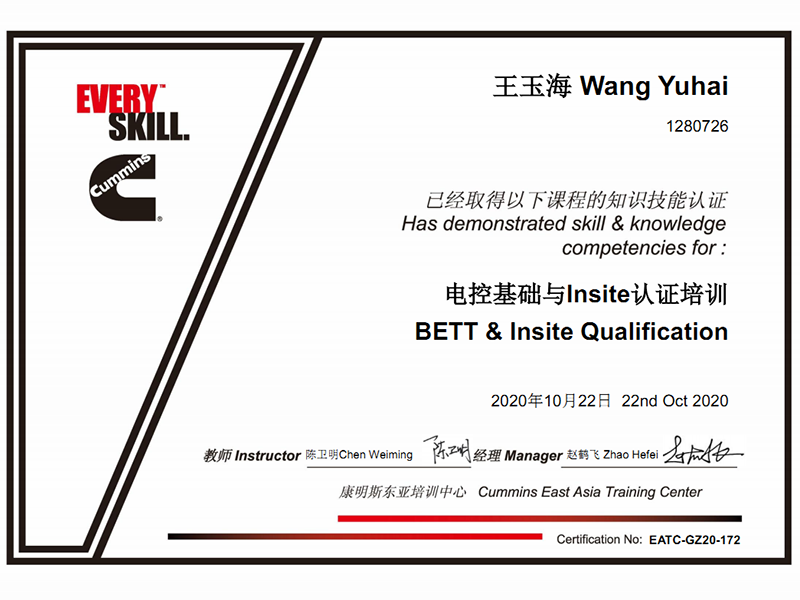 康明斯技能認(rèn)證證書